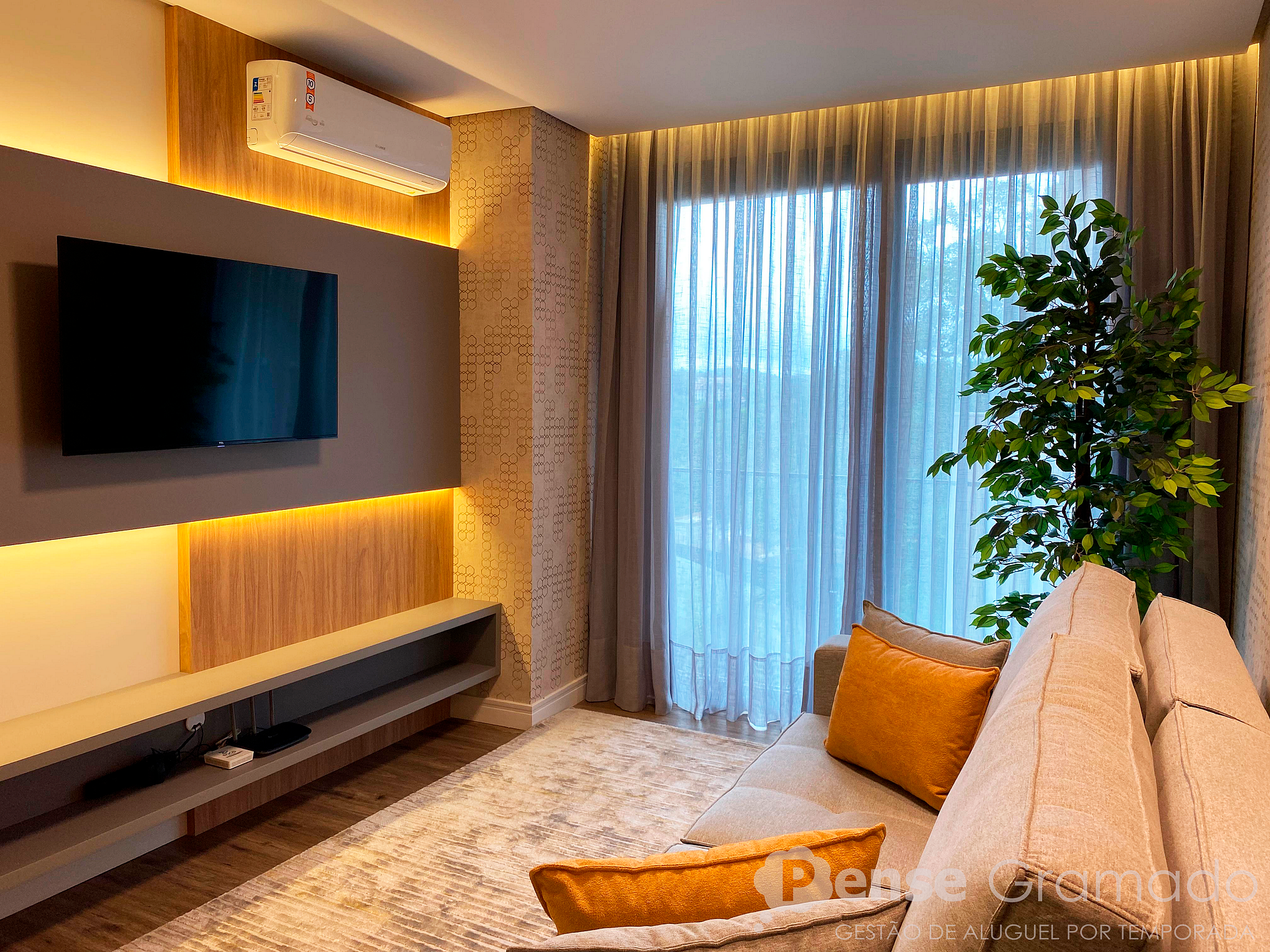 - Ar-Condicionado quente e frio na sala de estar e quarto;